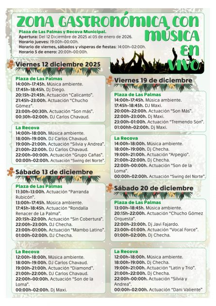 La programación arrancará desde las 14 horas del viernes 19 con música ambiente dando paso a sesiones de DJs y actuaciones en directo que se prolongarán hasta la madrugada. En la Plaza de Las Palmas, el público podrá disfrutar de las sesiones de DJ Maxi y de las actuaciones de grupos como Son Más y Tremendo Son, mientras que La Recova acogerá propuestas como Arpegio, Son de la Loma y Swing del Norte, combinando distintos estilos musicales para crear una oferta variada y atractiva.