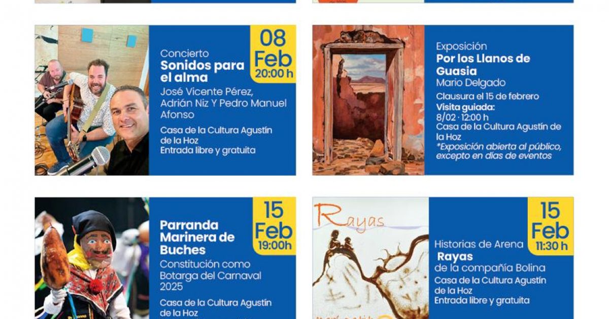 El Área de Cultura de Arrecife, bajo la dirección de la concejala Abigail González Guillén, presenta una variada agenda cultural para el mes de febrero. La programación incluye exposiciones, literatura y música, con actividades dirigidas a todos los públicos y de acceso gratuito en diferentes espacios culturales de la ciudad.