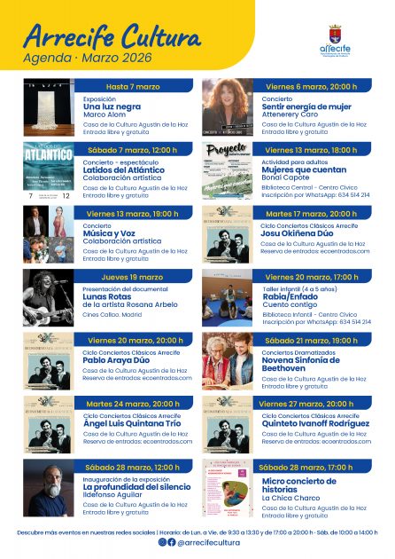 La agenda cultural de Arrecife para el mes de marzo arranca con una intensa programación musical en la Casa de la Cultura Agustín de la Hoz, organizada por Cultura Arrecife y dirigida por la concejala Abigail González.