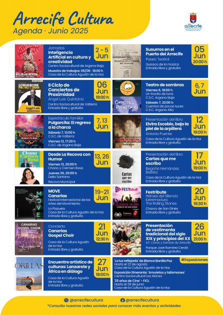 Los centros socioculturales de Argana Baja, Argana Alta, Valterra y Los Alonso así como el Parque José Ramírez Cerdá, también conocido como ‘Parque Viejo’, y calles aledañas al mismo serán escenario de la programación confeccionada para la primera semana de junio por Cultura Arrecife, dirigida por la concejala responsable de dicha área Abigail González.