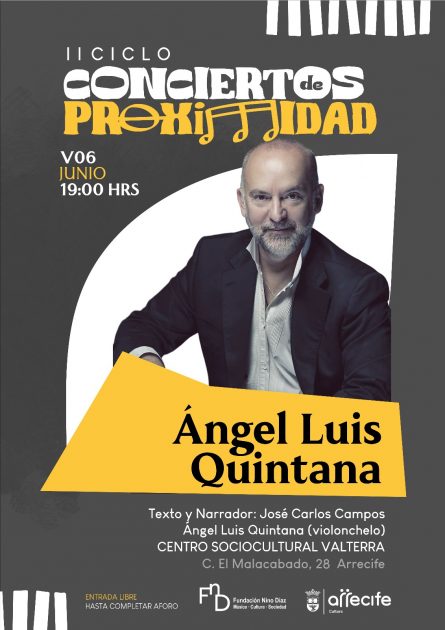 A las 19 horas del viernes 6, el Centro Sociocultural de Valterra albergará una nueva sesión del II Ciclo de Conciertos de Proximidad promovido por la Fundación Nino Díaz en colaboración con Cultura Arrecife con el objetivo de acercar la música de cámara y el conocimiento de los instrumentos musicales a toda la ciudadanía. Estará protagonizado por el violonchelista Ángel Luis Quintana y contará con la narración de José Carlos Campos.
