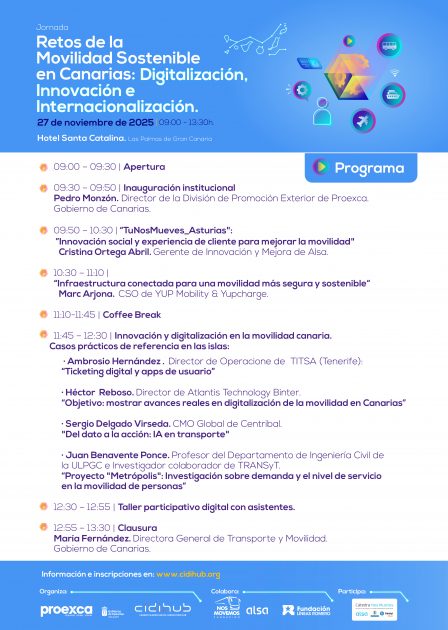 El próximo 27 de noviembre de 2025. La jornada “Retos de la Movilidad Sostenible en Canarias: Digitalización, Innovación e Internacionalización” reunirá a expertos, empresas e instituciones para debatir sobre los desafíos actuales y futuros de la movilidad en las islas. El evento está organizado por CIDIHub y PROEXCA, con el apoyo del Gobierno de Canarias y la colaboración de Fundación Nos Movemos – Alsa y Fundación Líneas Romero.