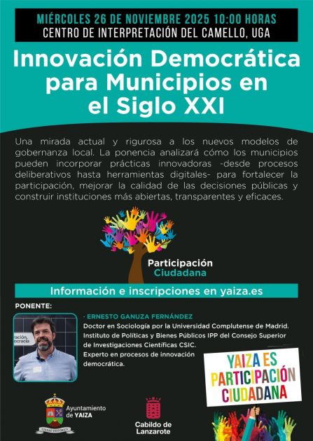 El Ayuntamiento de Yaiza, a través del Área de Participación Ciudadana, te invita a una interesante conferencia impartida por Ernesto Ganuza, sociólogo e investigador del CSIC, referente internacional en procesos participativos y modelos de gobernanza local.