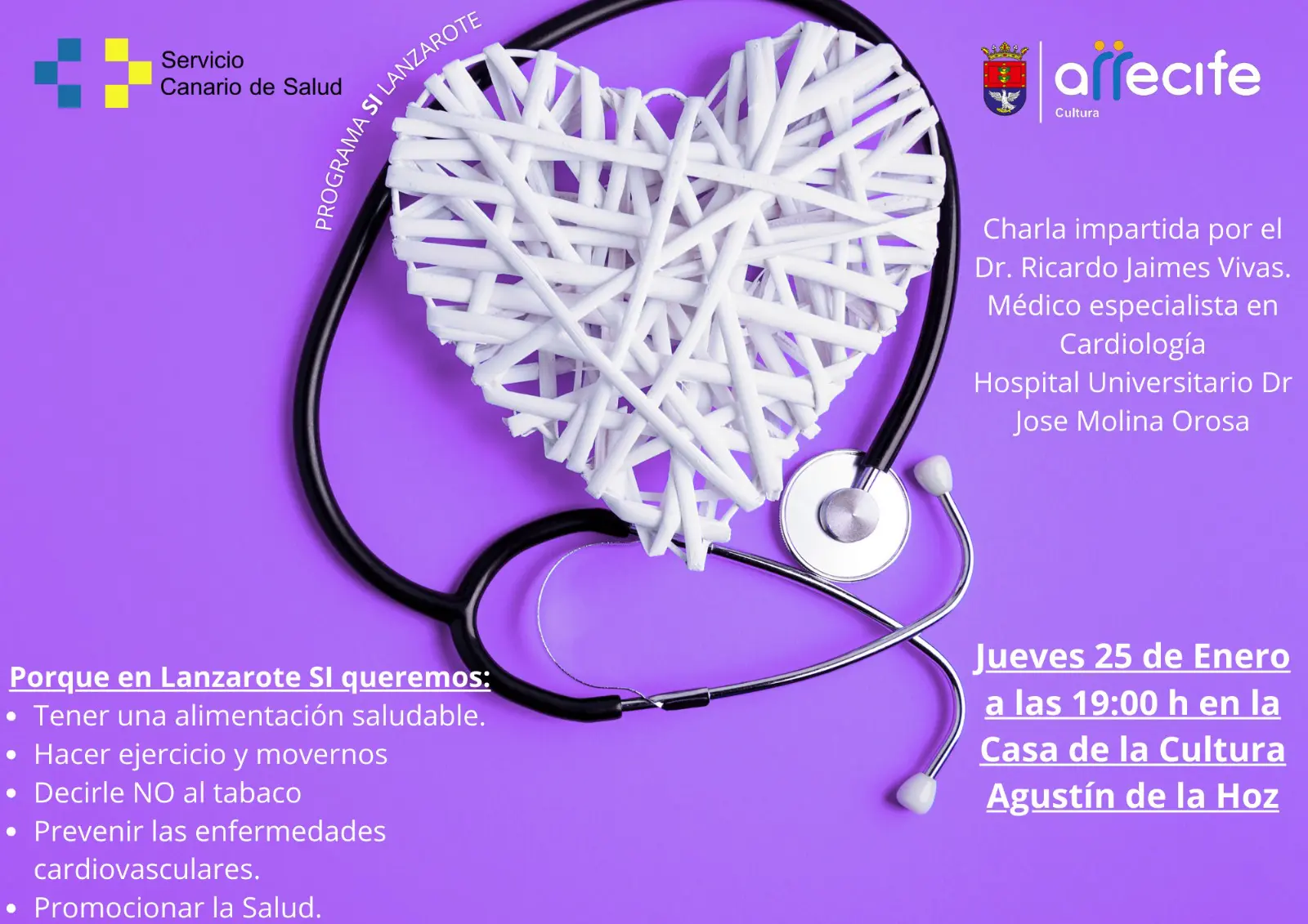 Se trata de una interesante charla abierta a la ciudadanía, a la que el alcalde de Arrecife, Yonathan de León, y la concejal de Cultura, Abigail González, invitan a la ciudadanía a asistir y a conocer las pautas para prevenir las enfermedades cardiovasculares.