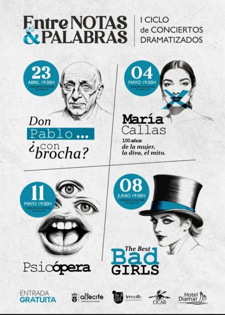 El I Ciclo de Conciertos Dramatizados “Entre notas y palabras” se estrenará el 23 de abril con el espectáculo “Don Pablo… ¿con brocha?”, que irá seguido de “María Callas, cien años de la mujer, la diva, el mito” (4 de mayo), “Psicópera” (11 de mayo) y “The best bad girls” (8 de junio).