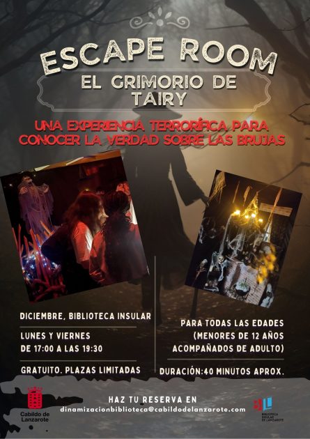 La Biblioteca Insular de Lanzarote, en colaboración con el Área de Educación del Cabildo de Lanzarote, acoge una nueva edición del escape room de temática terrorífica El Grimorio de Tayri. Esta actividad gratuita ofrece a los participantes una experiencia envolvente en la historia de la literatura clásica sobre brujas, invitándolos a resolver enigmas para avanzar a través de cinco escenarios escalofriantes.
