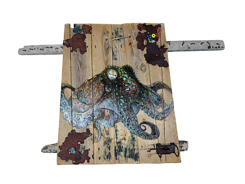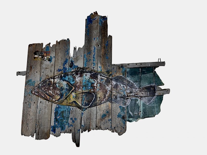 Maderas arrastradas por la marea, restos de embarcaciones, redes o plásticos se convierten en lienzos donde emergen especies como el angelote o la tortuga verde, recreadas con precisión y emoción. Cada pieza es el resultado de una profunda conexión con el entorno marino y de un diálogo entre arte y ciencia.