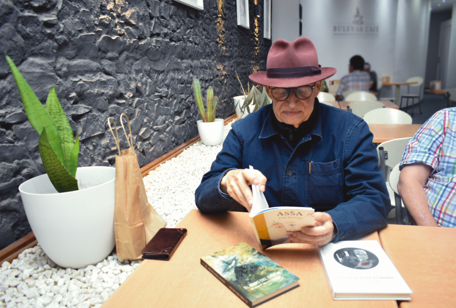 “Si me dices no quiero tus sueños, me secaré como un árbol sin agua”. El verso resuena en la voz de su autor, Félix Hormiga, que acaricia y repasa las páginas de “Assa” sentado en la cafetería del Bulevar de Arrecife, donde recala casi a diario. No es el único libro que ha llevado consigo esa mañana. También le acompañan otros títulos que muestra durante la entrevista, como si fueran sus vástagos, y se despide leyendo algunos fragmentos.