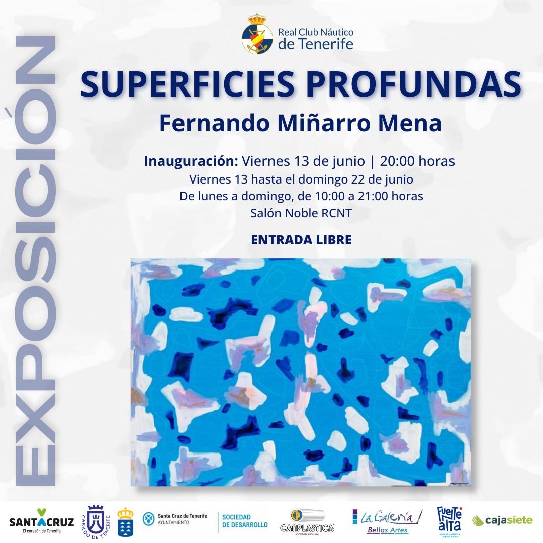 El artista Fernando Miñarro Mena presenta su exposición individual Superficies Profundas en el Real Club Náutico de Tenerife, con inauguración el viernes 13 de junio a las 20:00 horas en el Salón Noble de la institución. La muestra permanecerá abierta hasta el 22 de junio, en horario de 10:00 a 21:00 horas, con entrada gratuita.