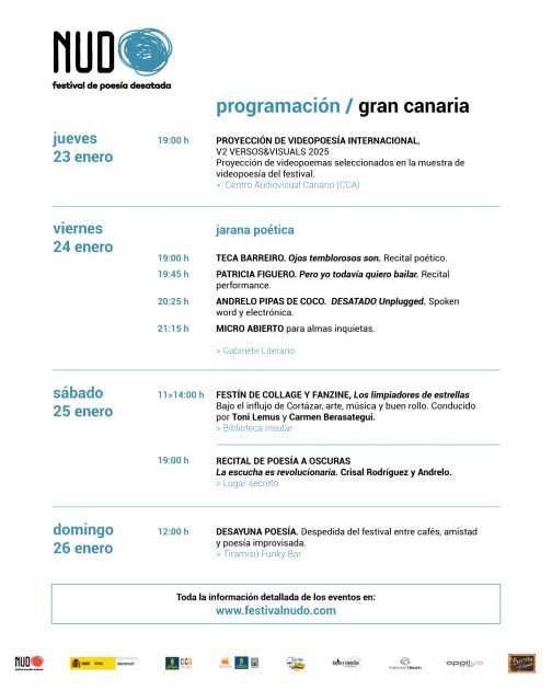 Festival de Poesía Nudo. NUDO aterriza por primera vez en Gran Canaria para ofrecer un encuentro único que celebra la poesía en todas sus formas y expresiones. Desde el 24 al 26 de enero de 2025, Las Palmas se convertirá en el epicentro de la poesía contemporánea con recitales, videopoesía, arte, spoken word y talleres creativos, que se desplegarán en espacios como el CCA Gran Canaria y la Biblioteca Insular del Cabildo.