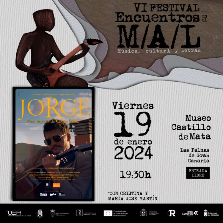 La película Jorge. Una travesía de Coque Malla, podrá verse en Canarias, dentro de la VI edición del Festival Encuentros en el M/A/L (Música, culturA y Letras), con la presencia de sus guionistas y directores Cristina y María José Martín Barcelona. La obra, que recorre la vida profesional y artística de este importante músico, desde la creación de Los Ronaldos hasta la actualidad, se proyectará este viernes, 19 de enero, a las 19:30 horas, en el Museo Castillo de Mata, en Las Palmas de Gran Canaria; y el sábado 20, a las 12 horas, en TEA Tenerife Espacio de las Artes, en la capital tinerfeña. En ambos casos, la entrada es gratuita hasta completar el aforo.