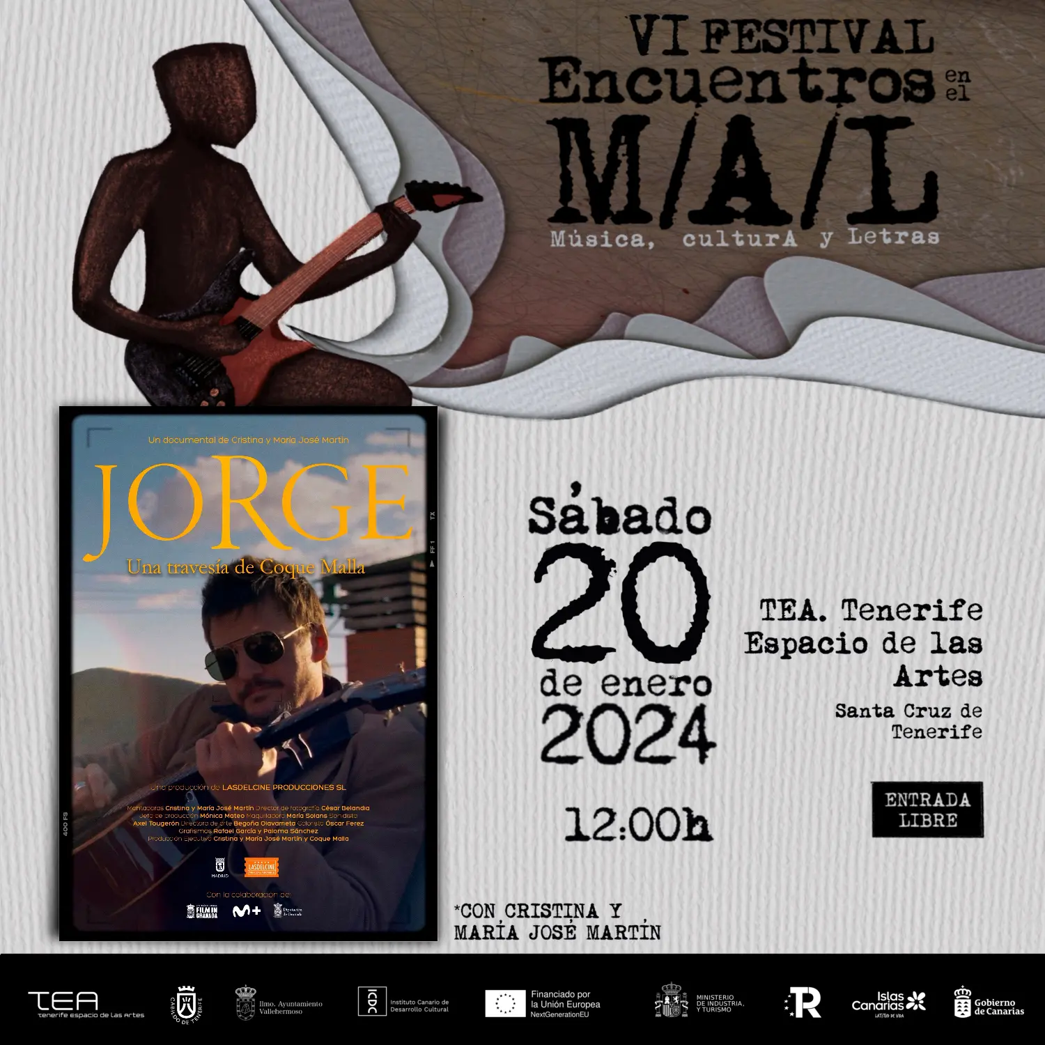 Continúa así el ciclo de Cine y Música del Festival, que comenzó con el estreno mundial de Ánimo Animal, un homenaje a Luis Eduardo Aute, y que también proyectará películas documentales relacionadas con Kiko Veneno y Santiago Auserón, además de sobre Lauren Jordan y Las Malas Compañías. Además, la programación se completa con encuentros con expertos, conciertos y artes plásticas. Esta iniciativa desarrolla actividades en Tenerife, Gran Canaria y La Gomera. La sexta edición de Encuentros en el M/A/L (Música, culturA y Letras), producido por Cauproges, es una actividad financiada con fondos europeos, a través del Mecanismo de Recuperación y Resiliencia, que forma parte del Instrumento denominado Next Generation EU; el Gobierno de Canarias, a través de sus empresas públicas PROMOTUR Turismo Islas Canarias e Instituto Canario de Desarrollo Cultural y Cabildo Insular de Tenerife, así como la colaboración del Ayuntamiento de Vallehermoso, y TEA Tenerife Espacio de las Artes.