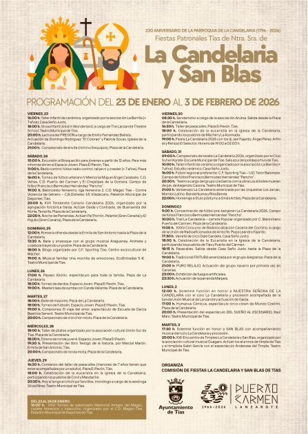 La programación completa de las fiestas de la Candelaria y San Blas 2026 se puede consultar en el apartado Próximos Eventos de la web oficial del Ayuntamiento de Tías: www.ayuntamientodetias.es.