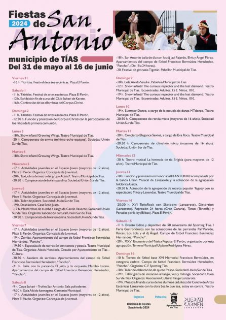Miércoles, 29 de mayo. Este viernes 31 de mayo darán comienzo en el municipio de Tías las fiestas en honor a San Antonio. El ayuntamiento de Tías ha diseñado unas fiestas que abarcan un amplio programa para el disfrute de todos los públicos del municipio y la isla de Lanzarote. “Tías tendrá unas fiestas para el recuerdo donde la juventud y los no tan jóvenes podrán disfrutar de un variado programa”, ha señalado el alcalde del municipio, José Juan Cruz Saavedra.