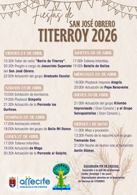 Las fiestas de Titerroy en honor a San José Obrero serán pregonadas por una representación del grupo de jóvenes de esta barriada arrecifeña que interpretaron la obra Jesucristo Superstar por distintos lugares de la Isla entre 1977 y 1980, lo que constituyó todo un fenómeno social en la época.