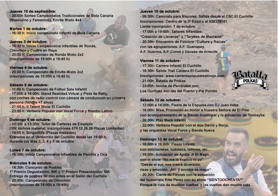 El concejal de Festejos del Ayuntamiento de Tinajo, Jonathan Pérez Olivero, “invita a l@s vecin@s de El Cuchillo y del resto del municipio a vivir unas fiestas del Pilar con actividades para todas las edades y gustos. Gracias a la Comisión de Fiestas de El Cuchillo por su dedicación en la preparación de estas fiestas, gracias”.
