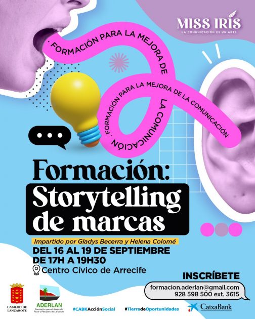 La Asociación para el Desarrollo Rural y Pesquero de Lanzarote (ADERLAN), en el marco del convenio firmado con CaixaBank para el desarrollo del proyecto Tierra de Oportunidades 2025, organiza la formación “Storytelling de marcas: cómo conectar con tu público”, que se celebrará del 16 al 19 de septiembre de 2025, en horario de 17:00 a 19:30 horas, en el Centro Cívico de Arrecife (C/ El Forito, s/n, junto a la Guardería Municipal).