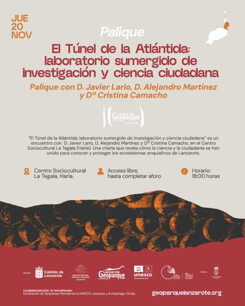 Con motivo del décimo aniversario del Geoparque Mundial UNESCO Lanzarote y Archipiélago Chinijo, el Cabildo de Lanzarote organiza la conferencia “El Túnel de la Atlántida: laboratorio sumergido de investigación y ciencia ciudadana”, impartida por los expertos Javier Lario, Alejandro Martínez y Cristina Camacho.