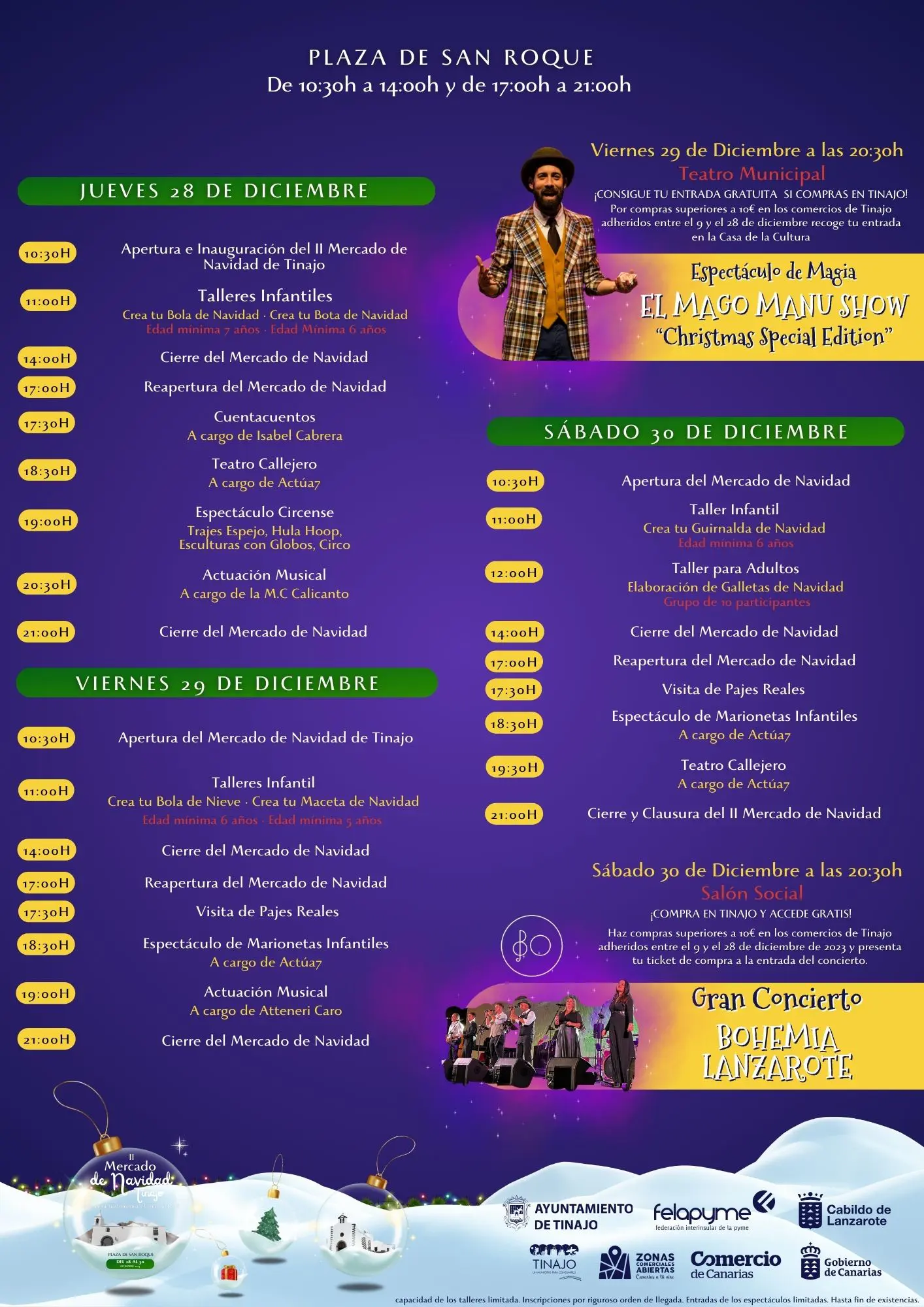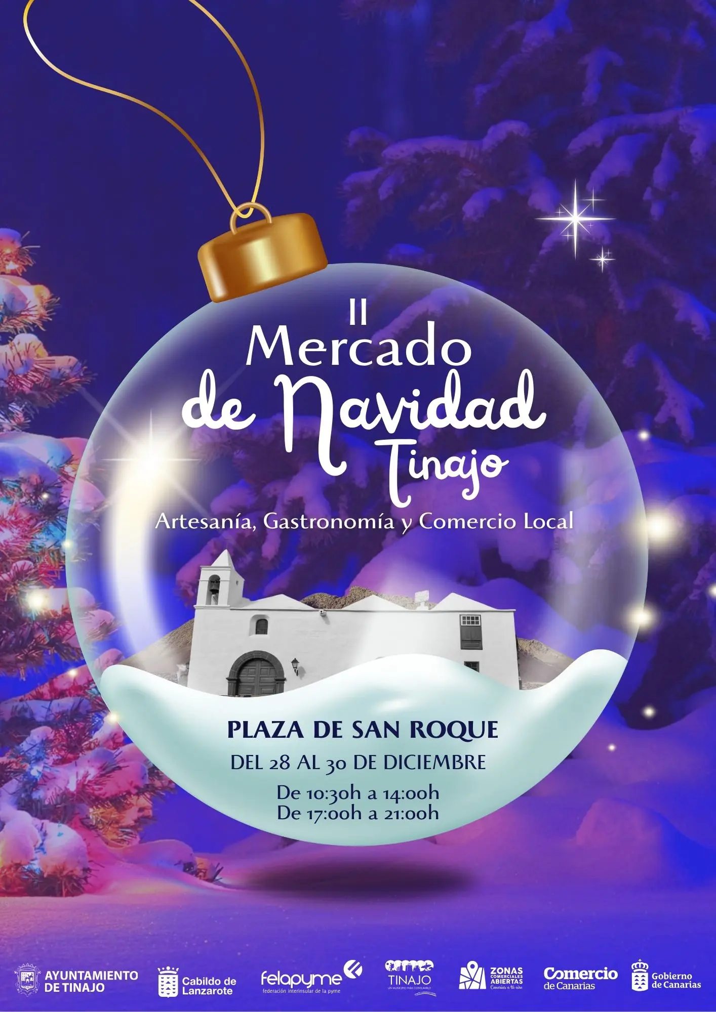 Del 28 al 30 de diciembre llega a Tinajo el II Mercado de Navidad del municipio, con un amplio programa de actividades para disfrutar en familia de la magia y la ilusión de las fiestas. Este evento se desarrollará en la Plaza de San Roque, junto al Belén, en horario: de 10:30h a 14:30h y de 17:00 h a 21:00 h y contará con productos artesanales únicos.