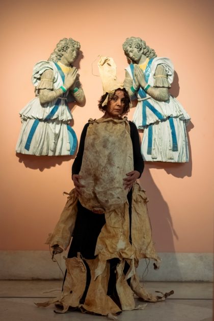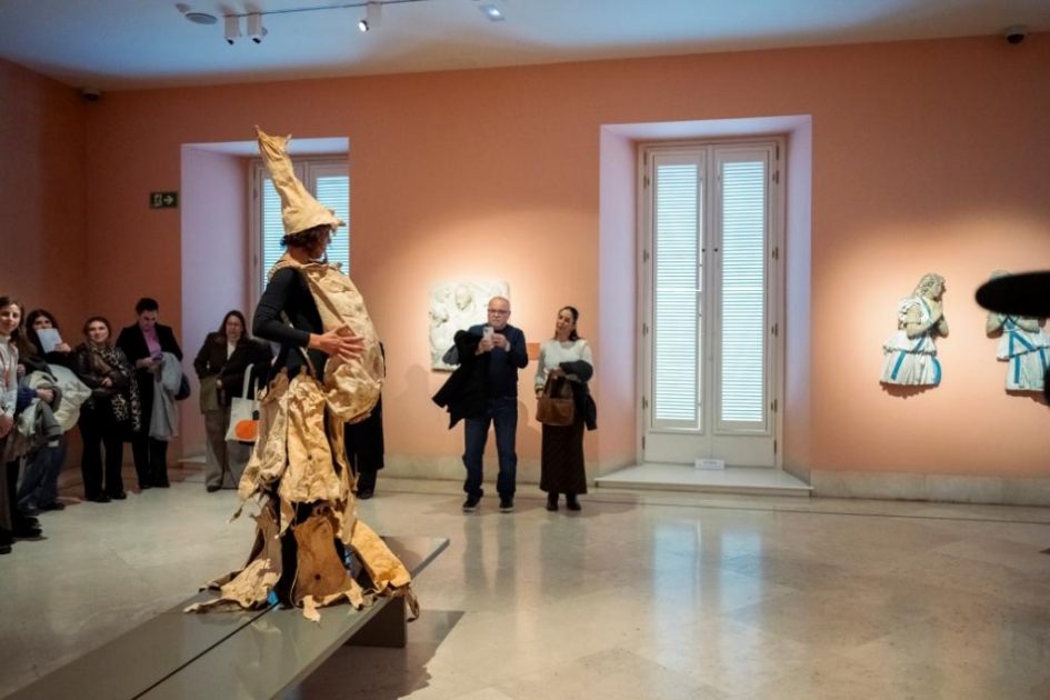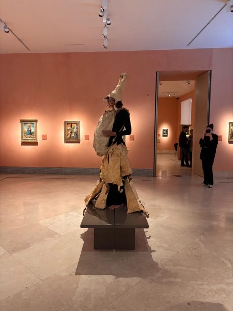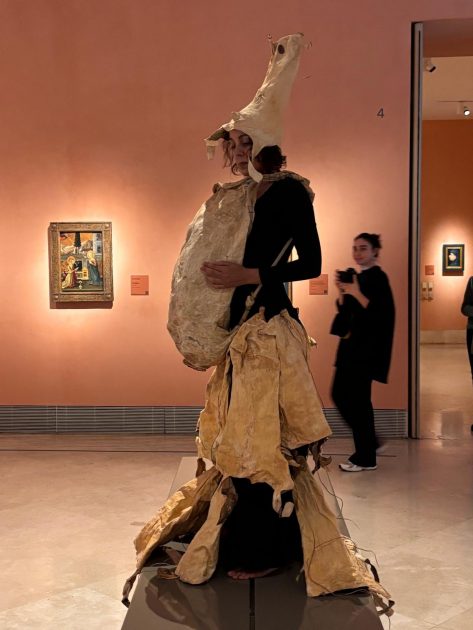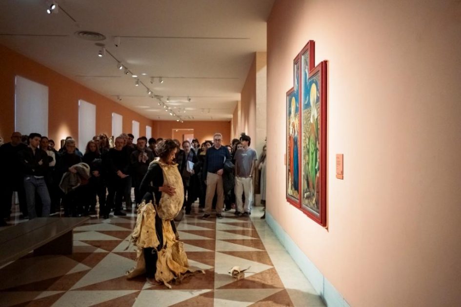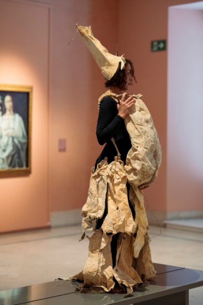Por consiguiente, vestida con pieles de cabra y portando un zurrón con gofio, M. Nieves activó su obra junto a varias tablas de la serie Vírgenes de leche (siglo XV, autoría anónima), en la sala dedicada al arte antiguo.