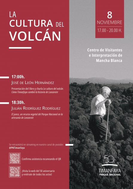 El programa de actos que conmemora el 50 aniversario del Parque Nacional de Timanfaya propone una nueva cita a la ciudadanía: será el viernes 8 de noviembre de 17:00 a 20:00 en el Centro de Interpretación y Visitantes de Mancha Blanca (Lanzarote), en una jornada dedicada a La Cultura del Volcán.