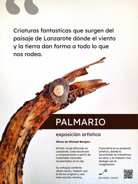 La exposición “Palmario” del artista Michael Bangiev (Fusionarte Lanzarote) se presentó recientemente en la Sociedad Democracia de Arrecife. Consiste en esculturas únicas hechas con materiales naturales de Lanzarote. Cada pieza refleja la originalidad y la capacidad del artista para transformar elementos orgánicos en obras con personalidad y belleza. La muestra tuvo una excelente recepción del público local. Las esculturas se expusieron en pedestales blancos, resaltando la singularidad de cada obra en una presentación minimalista y elegante. Ahora buscamos nuevos espacios culturales para llevar “Palmario” a más personas, compartiendo así este diálogo especial entre arte y naturaleza que refleja la esencia de Lanzarote.