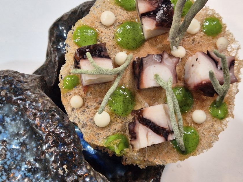 Esta elaboración combina tradición y vanguardia. La galleta, texturizada con milopectina, pasa por una plancha especial que aplica calor y presión, y posteriormente se liofiliza, consiguiendo un carácter aéreo y crujiente. Se acompaña de pulpo, emulsión de plancton y brotes de alga códium, evocando los matices del Atlántico que inspiran la cocina de Rigoberto Almeida.