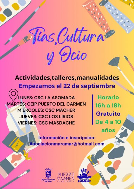El proyecto denominado “Tías, cultura y ocio”, financiado por el Ayuntamiento de Tías a través de la Concejalía de Cultura que dirige Pepa González, está gestionado por la asociación Maramar, que cuenta con una amplia trayectoria profesional en el trabajo con los más pequeños a través del aprendizaje y la diversión.