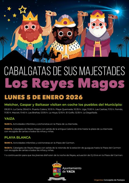 Las cabalgatas serán el lunes 5 de enero a las 17:00 h en Yaiza y a las 19:30 h en Playa Blanca. Durante la mañana del mismo 5 está previsto un recorrido por los pueblos del municipio