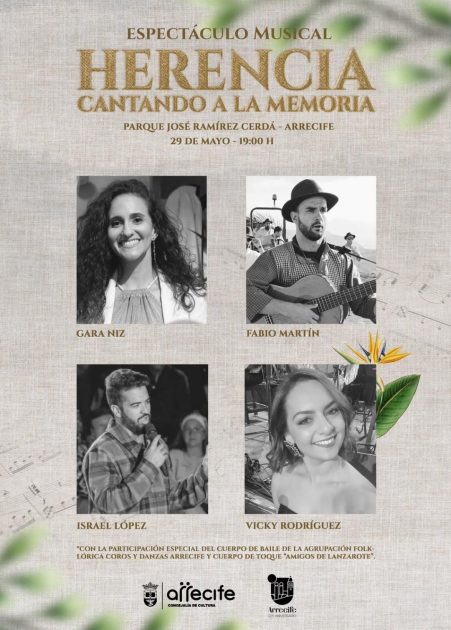La jornada festiva de este miércoles dará comienzo a las 19:00 horas en el Parque José Ramírez Cerdá con el espectáculo musical “Herencia. Cantando a la Memoria”, organizado por el Área de Cultura, que dirige Abigail González. Este evento contará con las actuaciones de artistas Gara Niz, Fabio Martín, Israel López y Vicky Rodríguez. También participará el cuerpo de baile de la Agrupación folclórica “Coros y Danzas de Arrecife” y cuerpo de toque “Amigos de Lanzarote”.