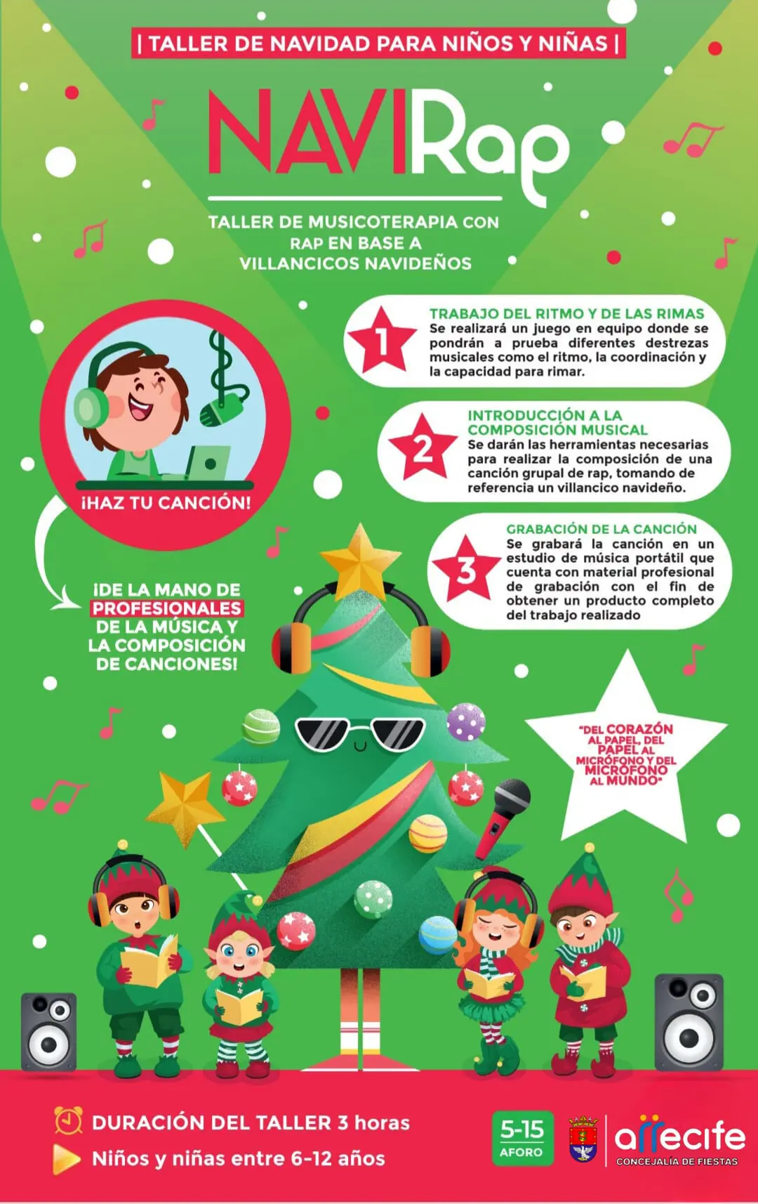 En segundo lugar, los menores participantes contarán con las herramientas necesarias para realizar la composición de una canción grupal de rap, tomando de referencia un villancico navideño.