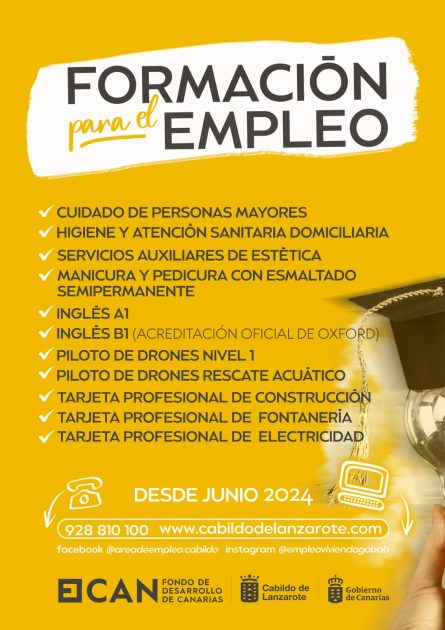 Las personas interesadas pueden inscribirse a través de la página web: www.cabildodelanzarote.com/area-de-empleo/plan-de-formación. Para obtener más información pueden llamar al teléfono 928- 810100/Ext: 2224,2305 y 2376.