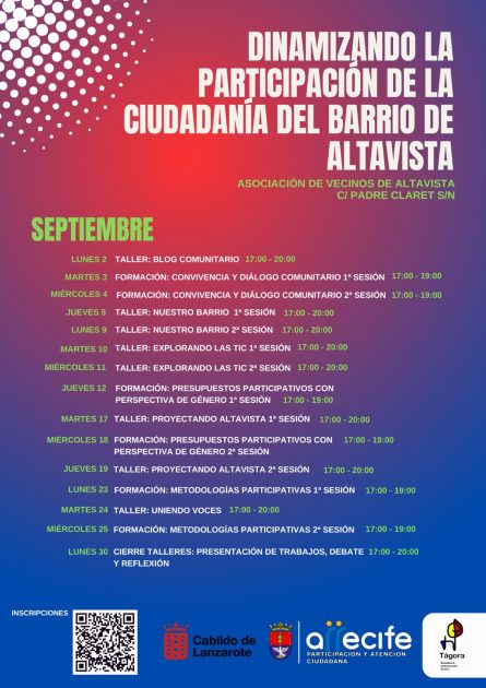 La Concejalía de Participación Ciudadana del Ayuntamiento de Arrecife, dirigida por Cathaysa Suárez, desarrollará a lo largo de este mes de septiembre un amplio programa de acciones formativas en el barrio de Altavista, que dan comienzo hoy lunes a las 17:00 horas.