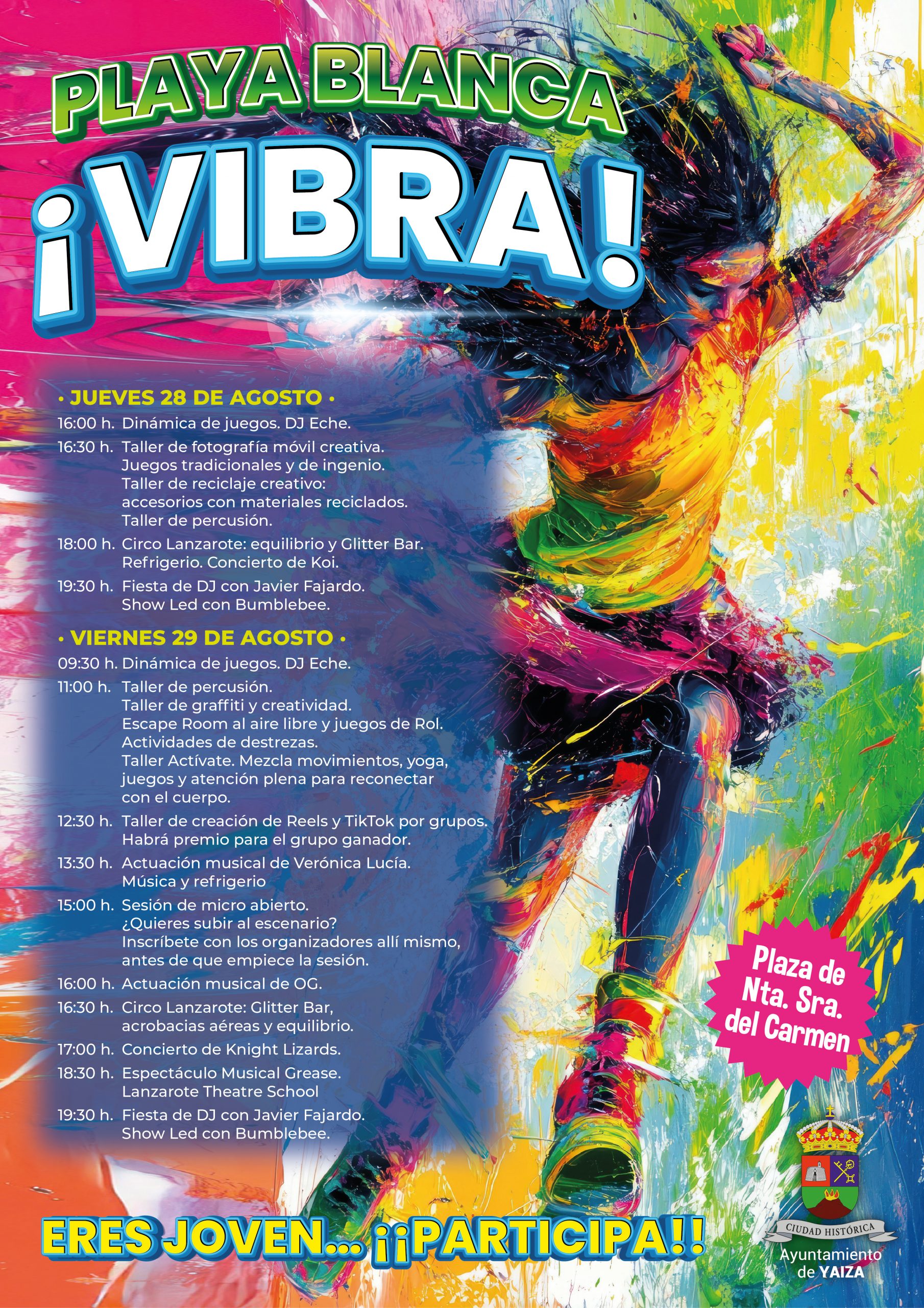 Festival de verano, quedada, fiesta gratis, encuentro creativo o todo a la vez, el nombre pasa a un segundo plano, pero la realidad es que el municipio de Yaiza convoca a la población más joven y a todo el que desee participar a dos días de música en directo, talleres creativos, DJ, espectáculos escénicos, circuito de habilidades y otras tantas actividades que acogerá la Plaza del Carmen el jueves 28 y viernes 29 de agosto en esta primera edición del Playa Blanca Vibra 2025.
