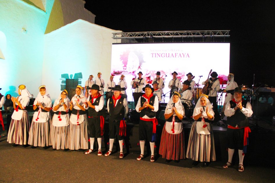 En la mesa presidencial se sentaba Juan José Pacheco, presidente de los pregoneros cuyos representantes agradecían al alcalde de Tinajo, Jesús Machín, y a la concejal, Yurena Cubas, su inmejorable predisposición desde que decidieron retornar como agrupación coincidiendo con el cincuenta aniversario desde su constitución. Mari tomaba la palabra y explicaba que “es un honor para Tinguafaya pregonar las Fiestas de Los Dolores, fiestas que anuncian la mayor celebración de nuestro pueblo y de nuestra tierra”. Los pregoneros recordaban “la leyenda de cuando los volcanes escupían lava y escoria” y el nacimiento del “santuario de Mancha Blanca y de la peregrinación cada 15 de septiembre con pescado y pan hasta el punto donde la Virgen paró la lava”. El pregón se llenó de emoción al recordar la historia del grupo folclórico y, sobre todo, al nombrar con cariño a antiguos miembros de la agrupación ya desaparecidos.