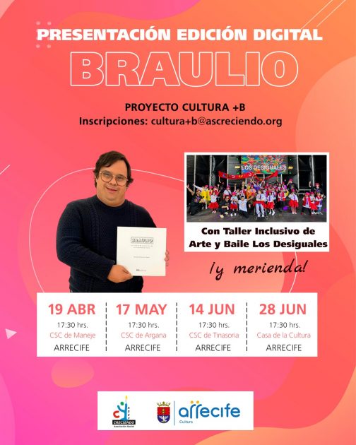 El acto incluirá un taller inclusivo de arte y baile para el que hay que inscribirse en [email protected] que correrá a cargo de Los Desiguales y contará con la participación del propio Braulio, quien con su publicación ha llevado a cabo una encomiable labor de concienciación sobre la importancia de fomentar la inclusión en todos los ámbitos de la sociedad.