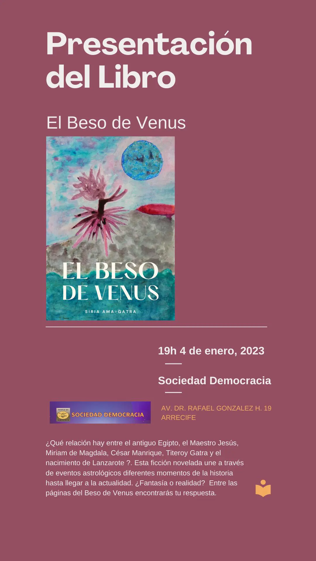 Presentación del tercer libro escrito en Lanzarote por la autora Ana María Angueira, afincada en Haría: “El beso de Venus”.