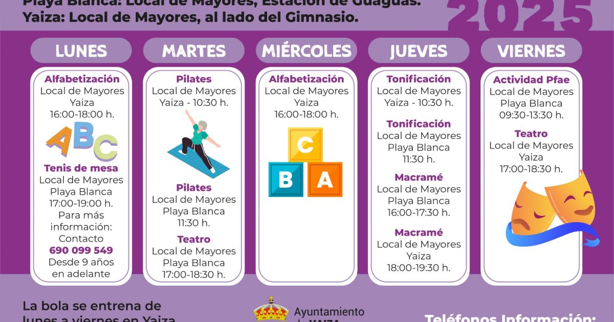 Personas mayores de Yaiza interesadas en las actividades pueden llamar a los números 679 453 803 y 928 830 403. El alcalde de Yaiza, Óscar Noda, valora “los puntos de encuentro e integración que suponen estas actividades, donde nuestros mayores no solo se sienten muy activos participando de tareas con las que disfrutan, sino que el programa continuo también evita situación de soledad no deseada. Desde aquí también es justo reconocer y agradecer públicamente la entrega y todo el cariño de las monitoras municipales para el grupo de mayores”.