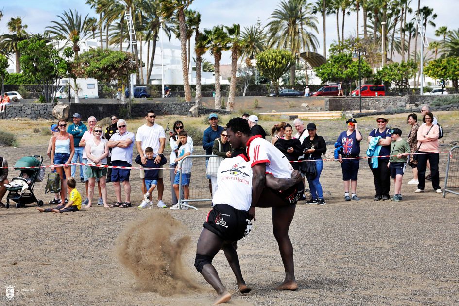 Además, el público pudo disfrutar de una exhibición de lucha canaria, donde se explicaron las técnicas y valores de este deporte autóctono, invitando incluso a dos participantes irlandeses a probar la experiencia sobre la arena.