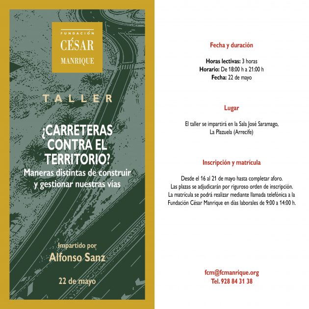 La Fundación César Manrique (FCM) organiza el taller titulado “¿Carreteras contra el territorio? Maneras distintas de construir y gestionar nuestras vías”, que será impartido por Alfonso Sanz, geógrafo, urbanista y matemático, experto en movilidad y cambio climático. La actividad tendrá lugar el próximo jueves 22 de mayo, entre las 18:00 y las 21:00 horas, en la sala José Saramago de La Plazuela (Arrecife).