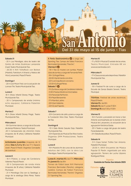 El municipio de Tías se vestirá de gala desde el 31 de mayo hasta el 15 de junio para celebrar las esperadas Fiestas de San Antonio 2025, una cita que incluye actividades culturales, deportivas, musicales y tradicionales. El programa destaca por la II Feria Gastronómica a cargo del Sporting Tías, el festival familiar Tirititías y el Encuentro de Música Popular El Pavón, que vertebran la celebración.