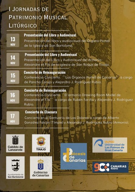 Tinajo acoge las I Jornadas de Patrimonio Musical Litúrgico. El Ayuntamiento de Tinajo informa sobre la celebración de las I Jornadas de Patrimonio Musical Litúrgico en la Parroquia de San Bartolomé y Tinajo. A la Iglesia de San Roque llegarán el 14 de noviembre con la presentación del libro y el audiovisual del armonio “Alexandre et Fils” de la propia iglesia de Tinajo.