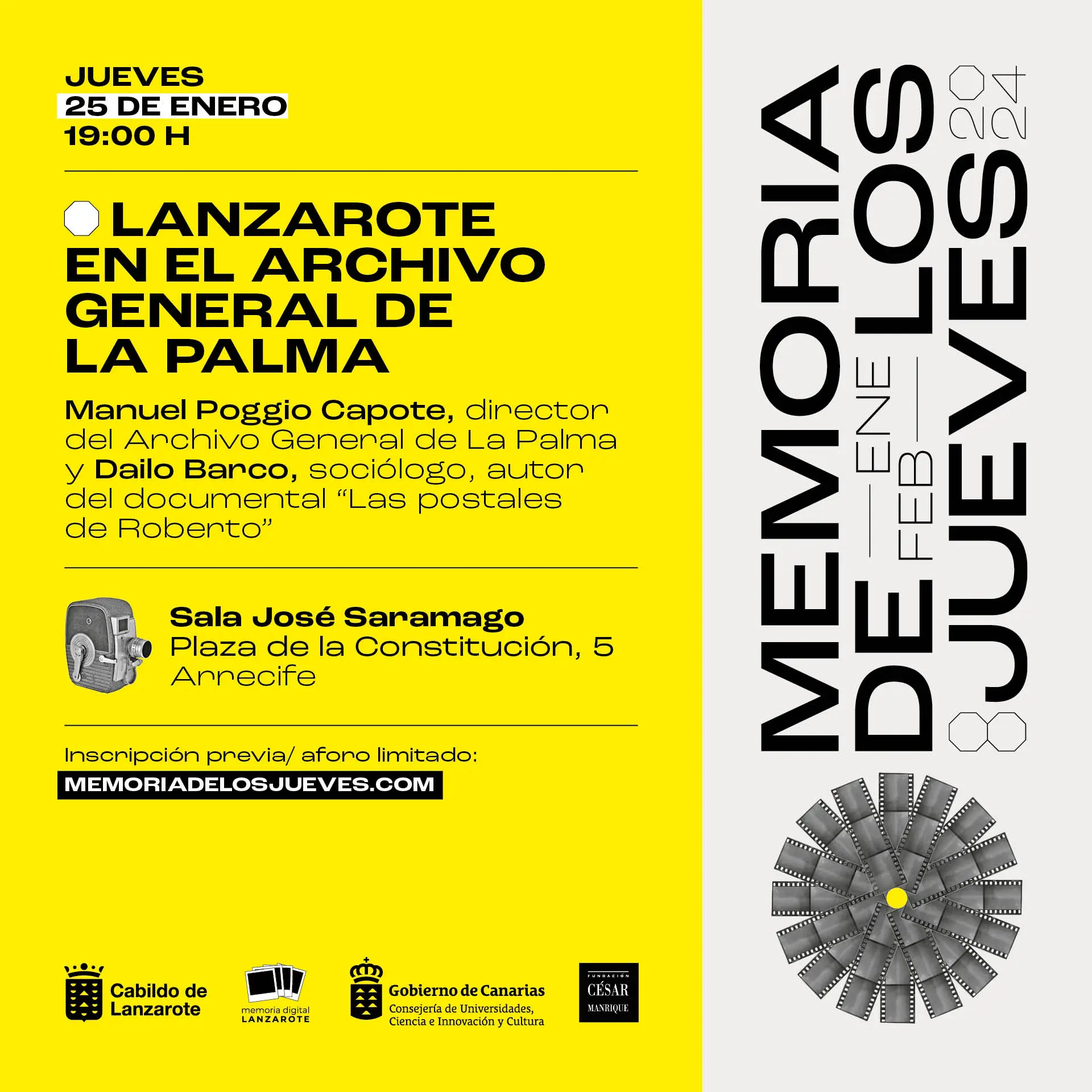 El ciclo de conferencias Memoria de los Jueves está organizado por el Cabildo de Lanzarote a través del Centro de Datos, cuenta con el patrocinio de la consejería de Universidades, Innovación y Ciencia y Cultura del Gobierno de Canarias y la colaboración de la Fundación César Manrique.