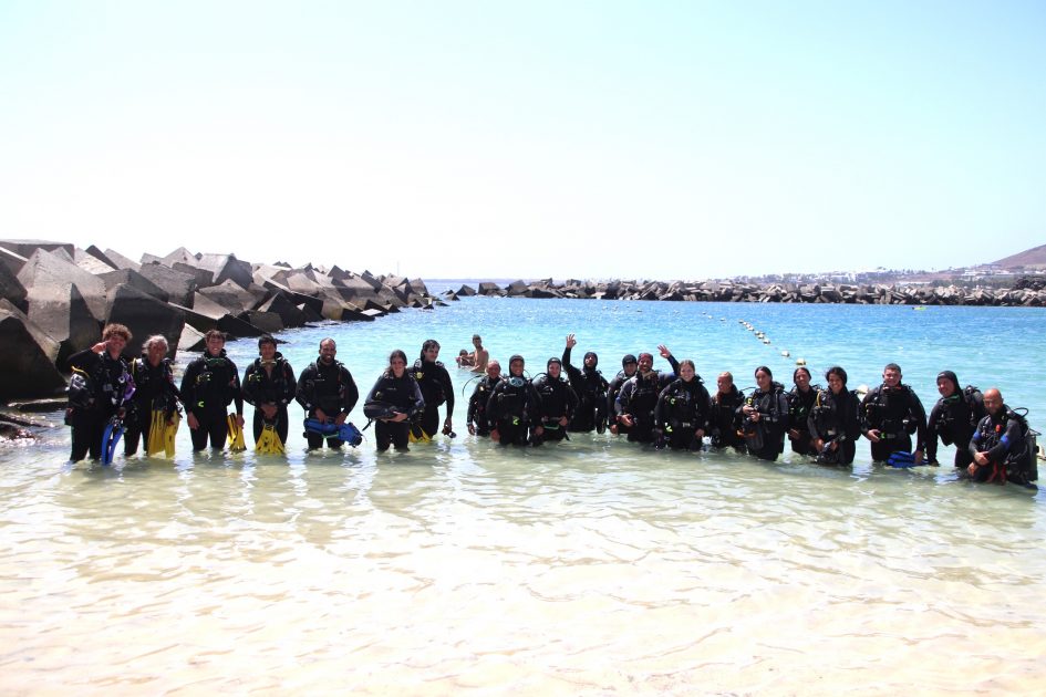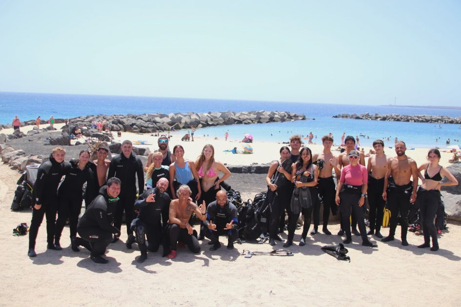 Guiados por siete monitores de Pura Vida, el grupo de veinte jóvenes atendió primero instrucciones teóricas en la sede del centro de buceo durante una hora para luego desplazarse a Playa Flamingo, ponerse el equipo y llevar a cabo la inmersión en uno de lugares más recurrentes para bucear en Lanzarote por la riqueza de su fondo marino.