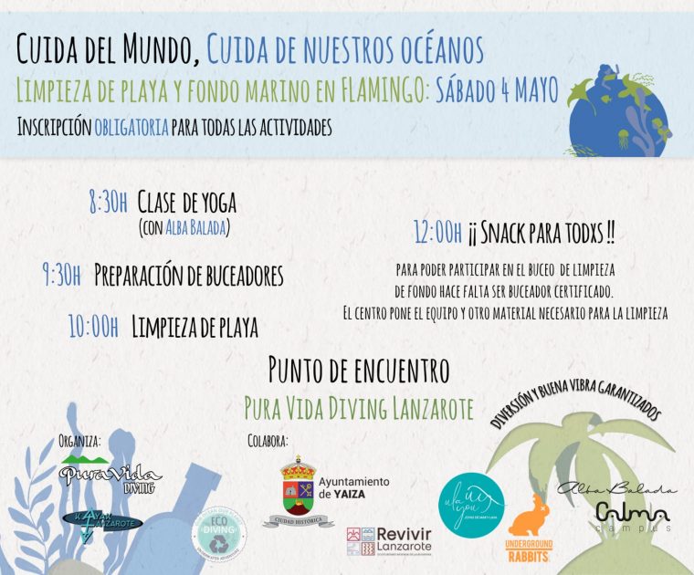 El Ayuntamiento de Yaiza, Pura Vida Diving y Kayak Lanzarote animan al voluntariado de Lanzarote a participar de una nueva jornada de limpieza de playa y fondo marino en la localidad turística de Playa Blanca, que se llevará a cabo en Playa Flamingo el día sábado 4 de mayo a las 10:00 horas. Las personas interesadas en participar deben rellenar y enviar el formulario virtual publicado en portada de www.yaiza.es